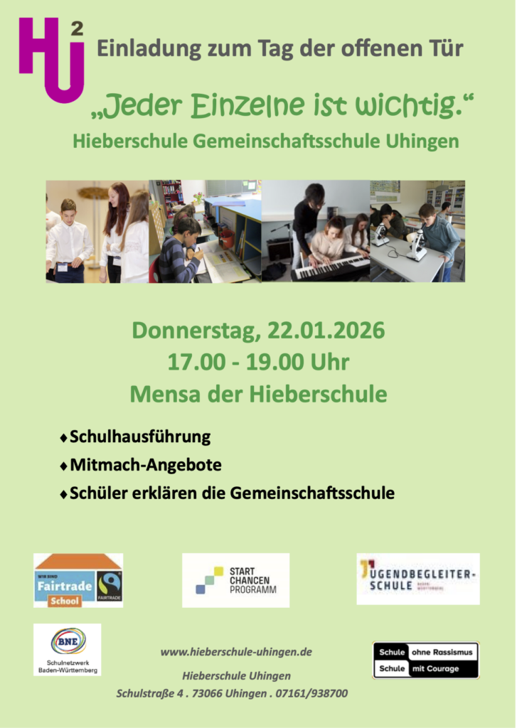 Am Donnerstag, den 23. Januar 2026, findet wieder der „Tag der offenen Tür“ an der Hieberschule in Uhingen statt. Wie jedes Jahr erwartet die Besucherinnen und Besucher ein abwechslungsreiches Programm mit vielen Mitmachaktionen.